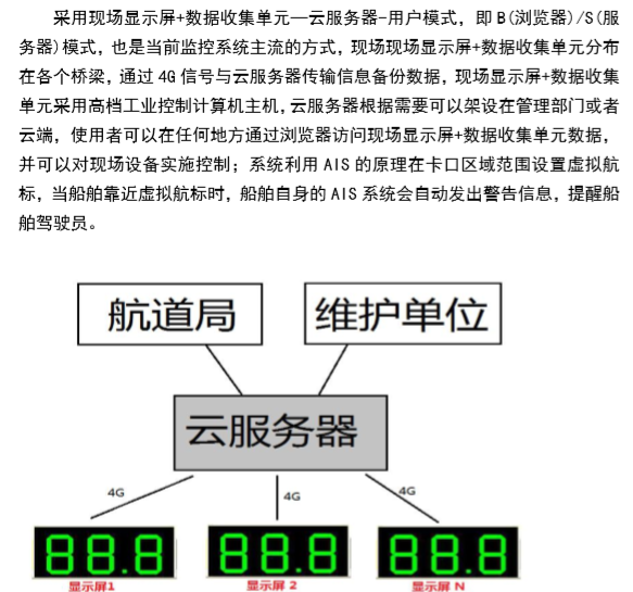 采用現(xiàn)場顯示屏+數據收集單元—云服務器-用戶模式,即B(瀏覽器)/S(服務器)模式,也是當前監(jiān)控系統(tǒng)主流的方式,現(xiàn)場現(xiàn)場顯示屏+數據收集單元分布在各個橋梁,通過4G信號與云服務器傳輸信息備份數據,現(xiàn)場顯示屏+數據收集單元采用工業(yè)控制計算機主機,云服務器根據需要可以架設在管理部門或者云端,使用者可以在任何地方通過瀏覽器訪問現(xiàn)場顯示屏+數據收集單元數據,并可以對現(xiàn)場設備實施控制;系統(tǒng)利用AIS的原理在卡口區(qū)域范圍設置虛擬航標,當船舶靠近虛擬航標時,船舶自身的AIS系統(tǒng)會自動發(fā)出警告信息,提醒船舶駕駛員。